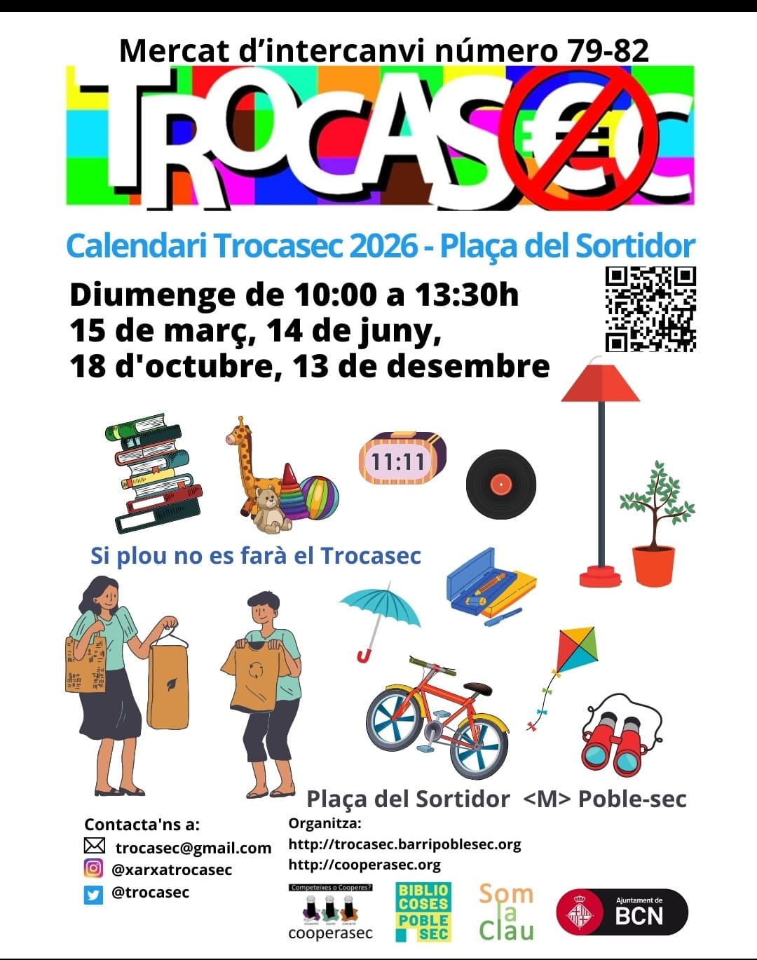 En aquest mercat, hi haurà un punt d’informació de Trocasec, de Las Espigadoras, Cuidem Montjuic, Aula ambiental Poble Sec i d’altres entitats i col.lectius de la xarxa cooperasec. A més comptarem amb parades per donar suport a diferents campanyes de col.lectius del barri.
